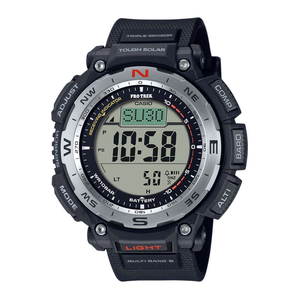 時計液晶部には、デュプレックスLCDを採用しました。方位表示部と時計機能表示部の液晶を別にしたデュプレックスLCD により、コンパス表示を大型化し、判読性を高め、より方角が分かりやすい機能美あるデザインで表現しています。更に簡易方位メモリーに役立つ回転ベゼルを採用しています。