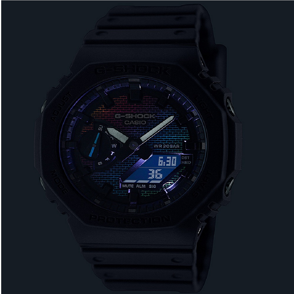 G-SHOCKのアイコニックなデザインであるレンガパターンを光の反射によりさまざまな色合いを見せるレインボーカラーで表現。壁を乗り越えて、常に限界を超えて挑戦していくタフネススピリットを表現しました。