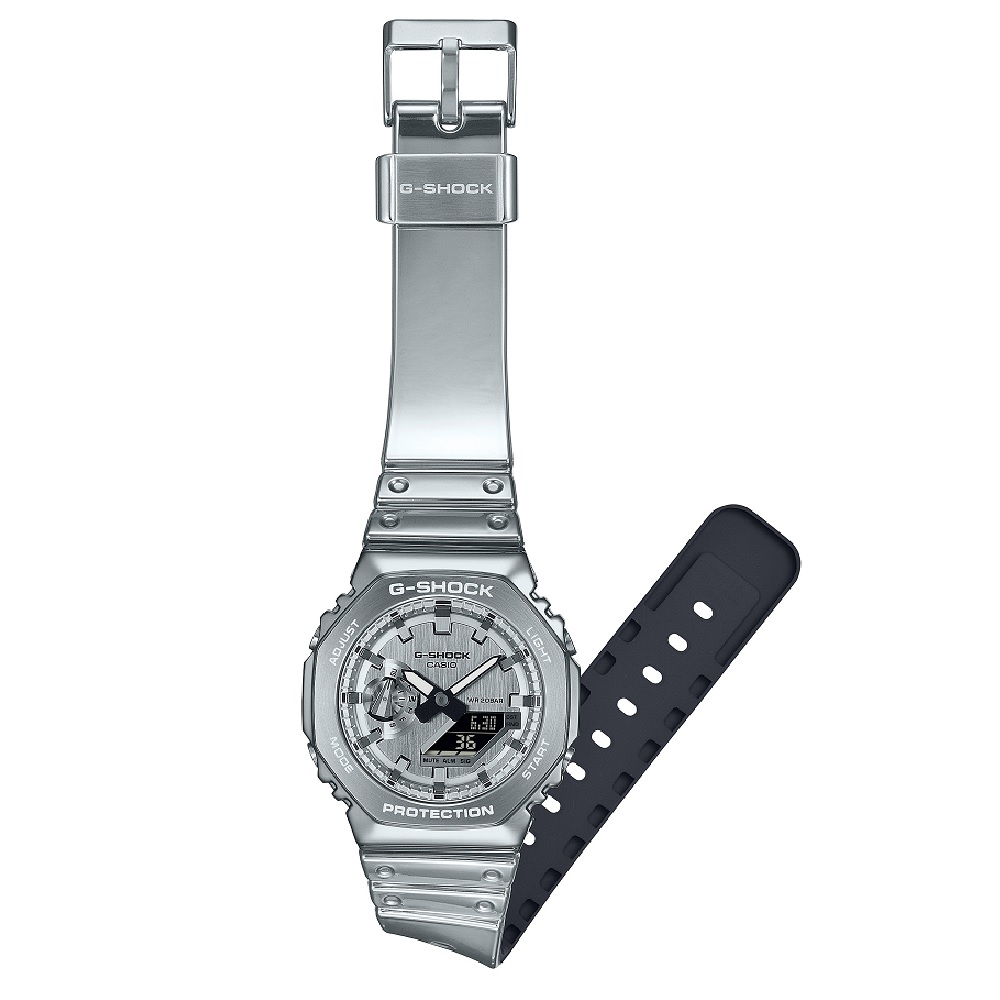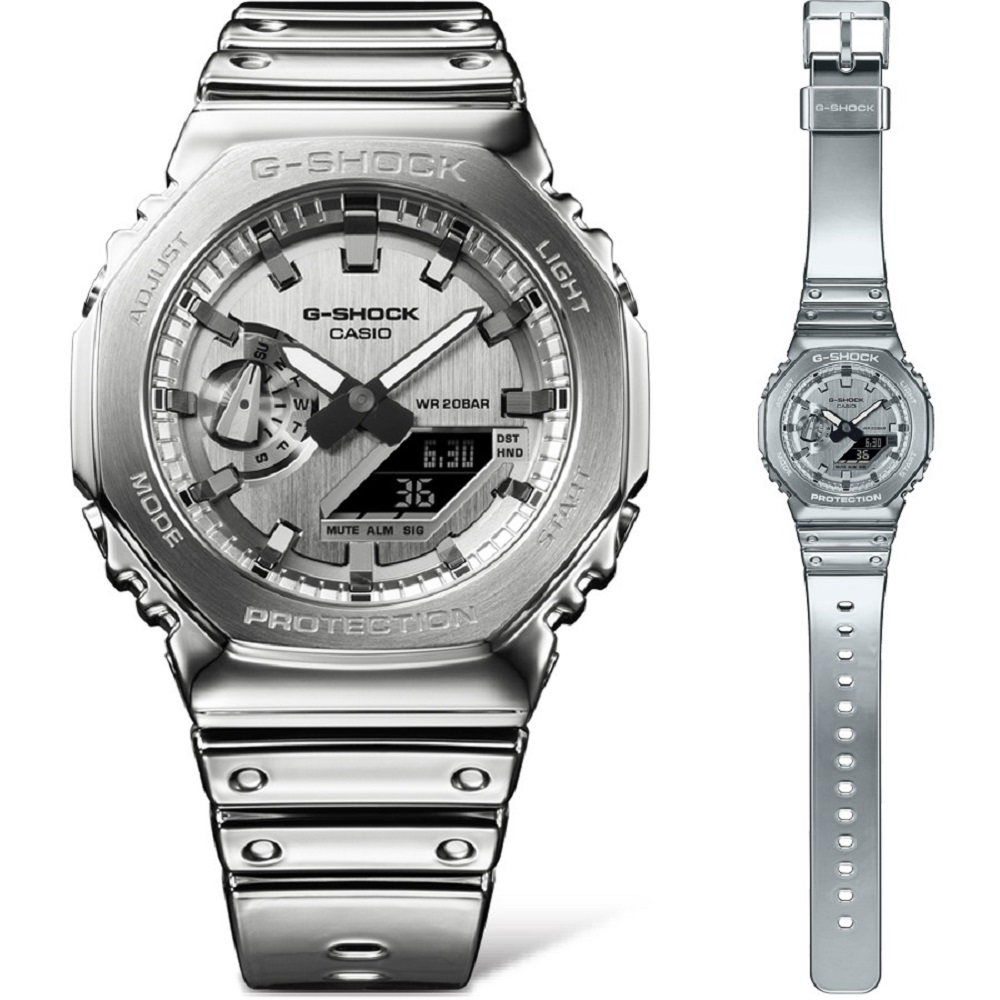 1983年の発売以来、飽くなき強さを求めて進化を続けるタフネスウオッチG-SHOCKから、シルバーのワントーンでまとめた、FINE METALLIC SERIESです。ベースモデルには、オクタゴンベゼルのGM-2100を採用しています。