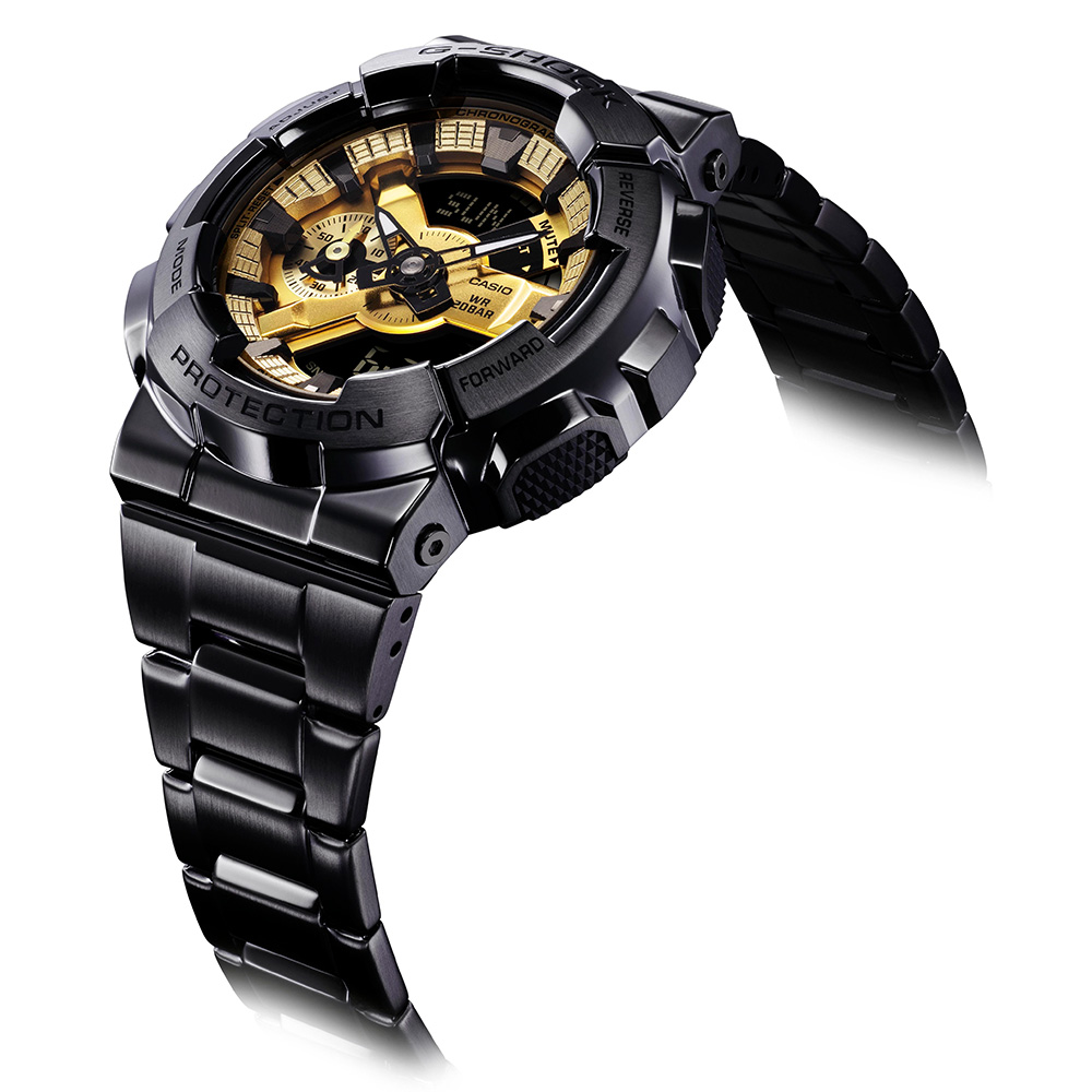 そのアイコニックなスタイルで人気モデルのひとつであるビッグケースのアナログ・デジタルコンビネーション、「110シリーズ」のベゼルとバンドを金属素材にアップデートしたGM-110です。