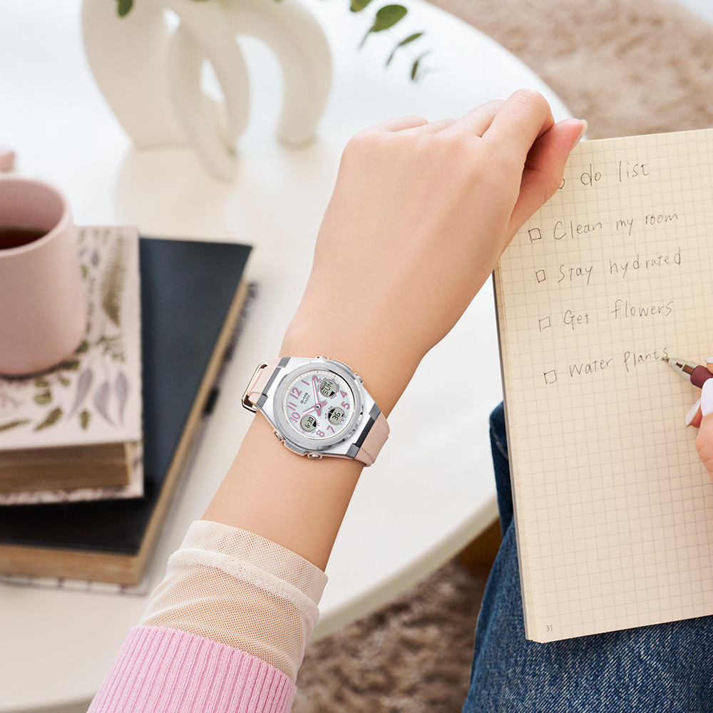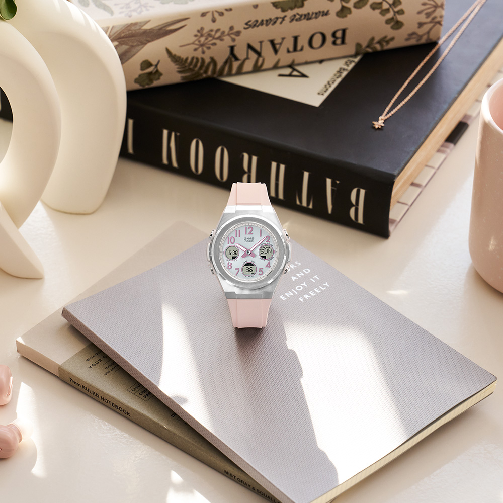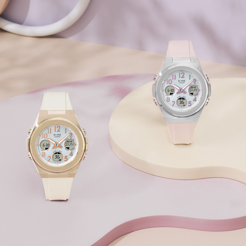 アクティブで洗練された女性に向けたBABY-G G-MS(ジーミズ)。視認性の良いアラビック数字をインデックスに取り入れたモデルに、上品で着けやすいニュアンスカラー2色が追加されました。