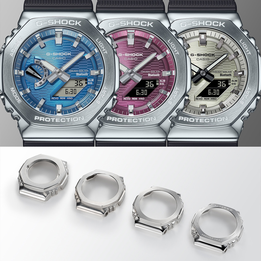 1983年の発売以来、飽くなき強さを求めて進化を続けるタフネスウオッチG-SHOCKから、2100シリーズの特徴であるスリムなサイズ感をキープしながら、スマートフォンリンクとタフソーラーを搭載したメタルベゼルのモデルです。ケース、バンドの主な樹脂パーツにはバイオマスプラスチックを採用し、環境にも配慮しました。