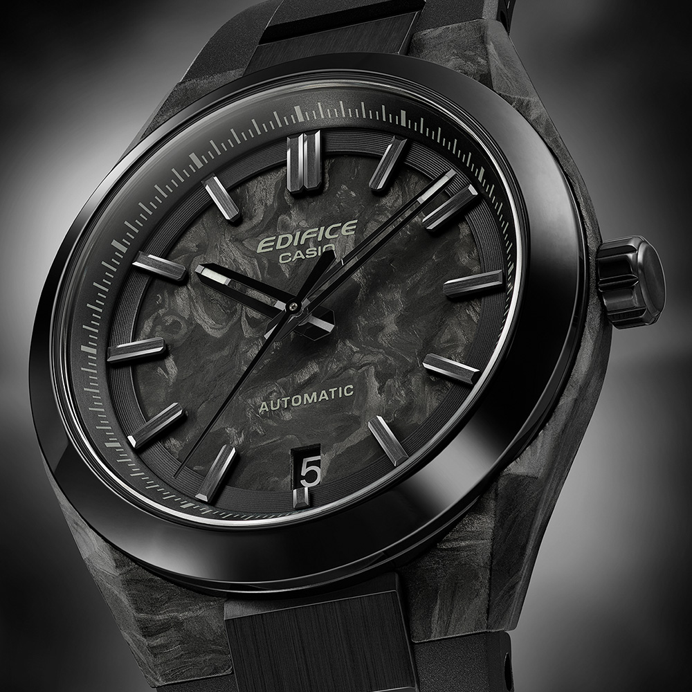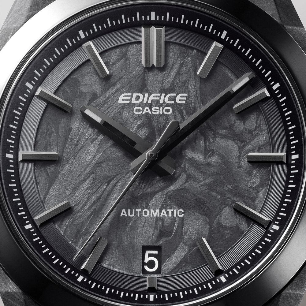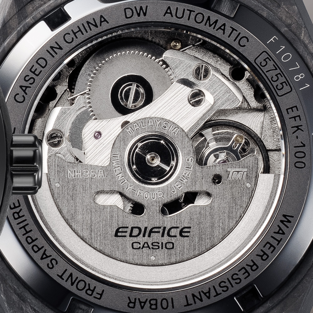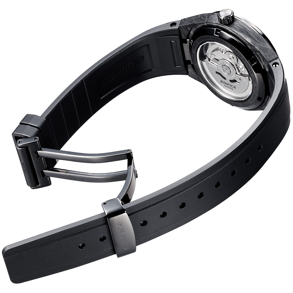 高級スポーツカーにも使用されるフォージドカーボンをEFK100XPBにはケースと文字板、EFK-100YCDには文字板に採用することで更なるパフォーマンスを求めて進化を続けるラグジュアリーなスポーツカーの世界観をEDIFICEらしいスタイリングで表現しました。