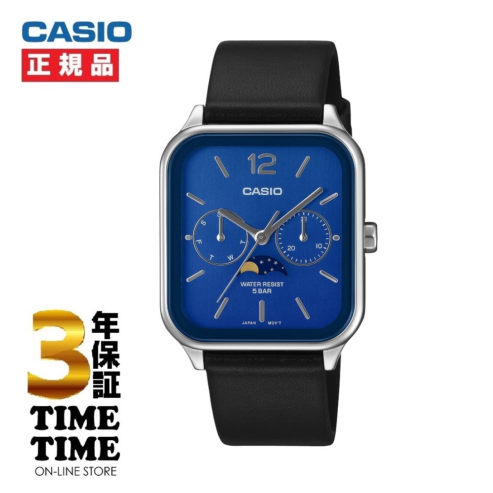 月の満ち欠けを確認できる、ムーンフェイズ機能付きのアナログ腕時計です。スタイリッシュな形状と複数のサブダイアルが印象的なモデルです。5気圧防水仕様で、手洗いや突然の雨でも安心です。