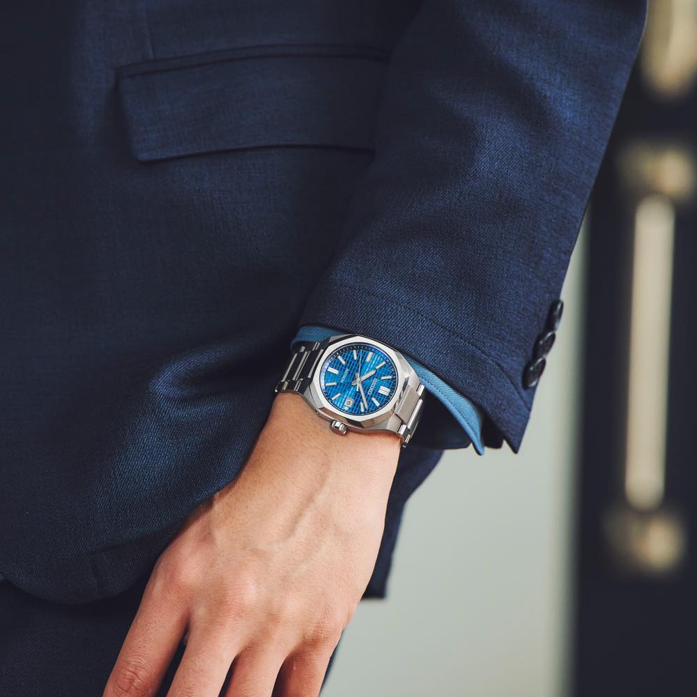 腕元でエクスクルーシブな存在感を放つ、ダイナミックかつ力強い金属多角縁に加え、エッジの効いたソリッドなチタンケースと質感の高い3列ブレスレットによって精悍かるスタイリッシュな雰囲気を演出。