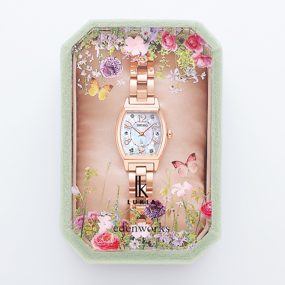 ルキアのブランドパートナーであるedenworksとコラボレーションした当モデルでは、花々が満開に咲き誇る幸福感溢れる様子を、白蝶貝ダイヤル外周部に表現しました。傾けることで花のパターンがさりげなく輝くデザインです。