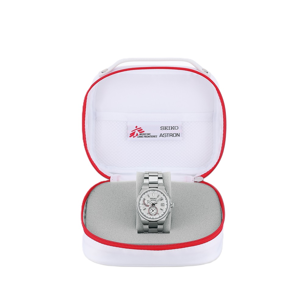 質感の高いホワイトカラーのダイヤルをベースに、国境なき医師団ブランドカラーであるレッドをあしらった特別なカラーリングを採用。