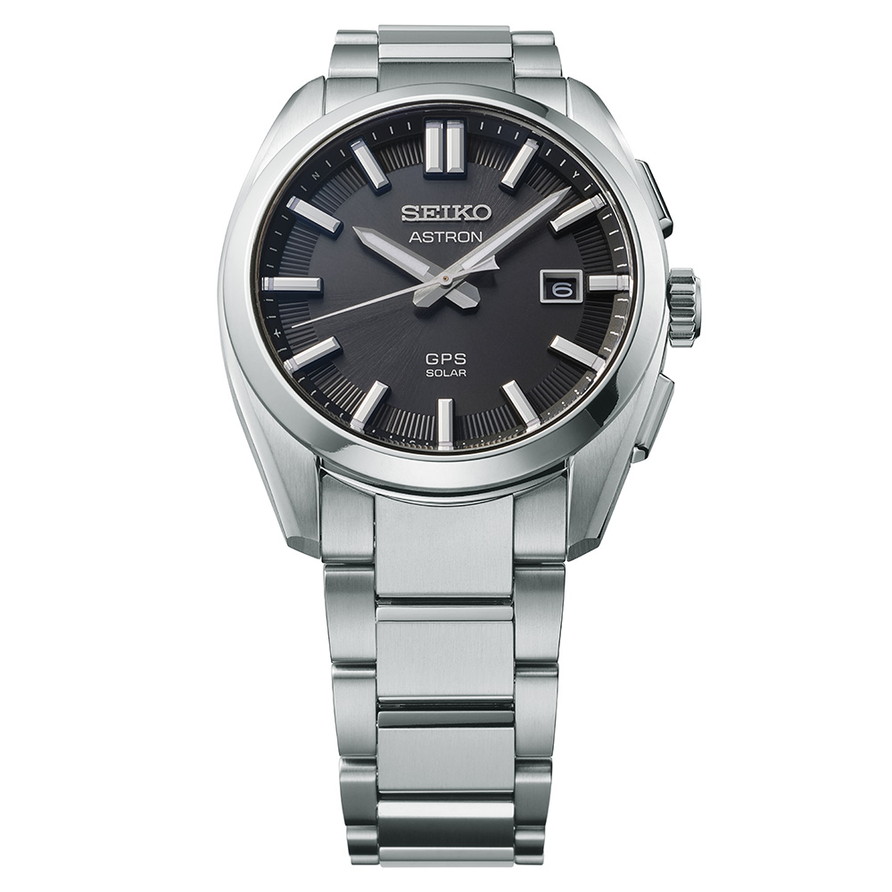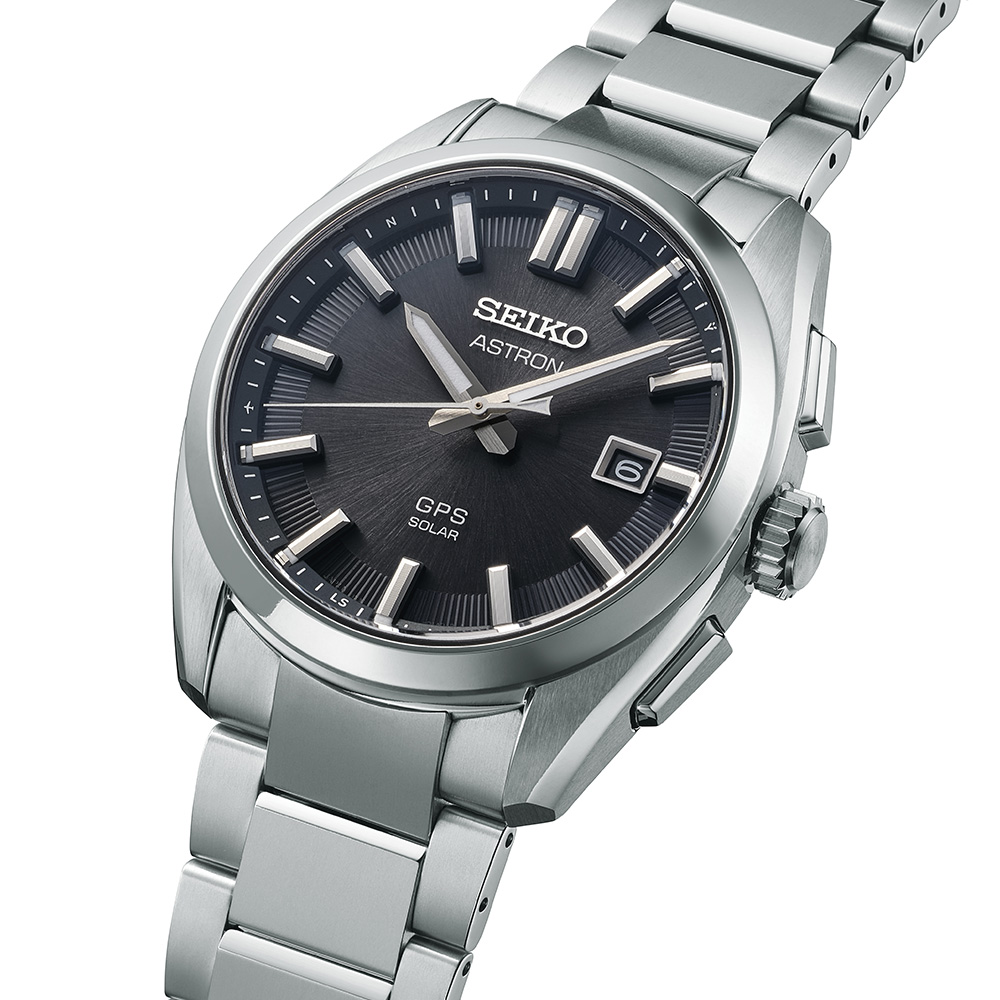 縦軸を強調するように施されたケース、ブレスレットの鏡面仕上げが、ケースサイズをコンパクトに見せつつも、腕元でさりげない高級感を演出します。駆動方式 ソーラーGPS衛星電波修正