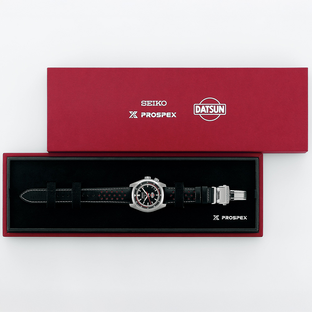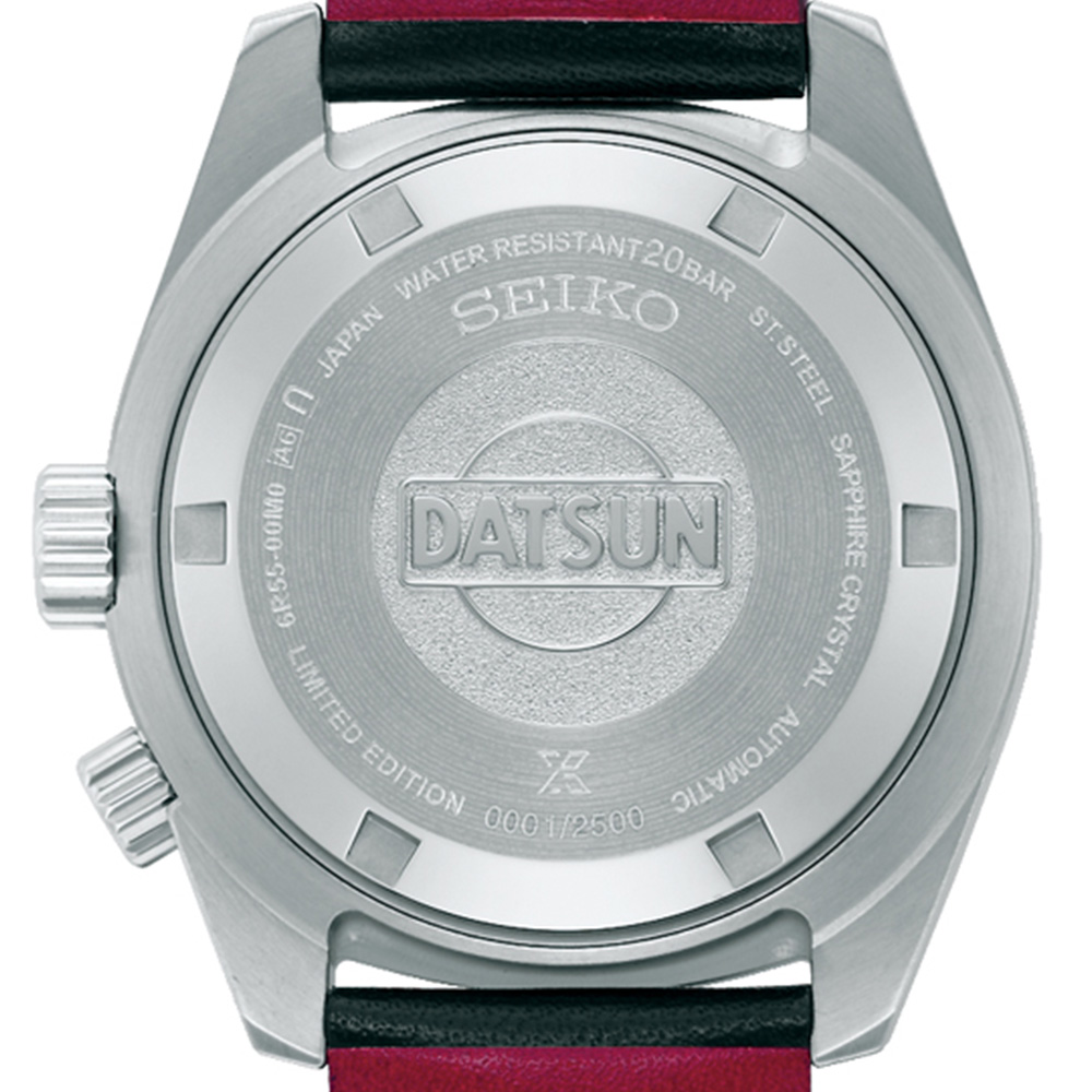 当時の「DATSUN」ロゴマークをダイヤル、ケースバック、バックルの3箇所にレイアウトしたコラボレーション限定モデルならではの特別仕様です。