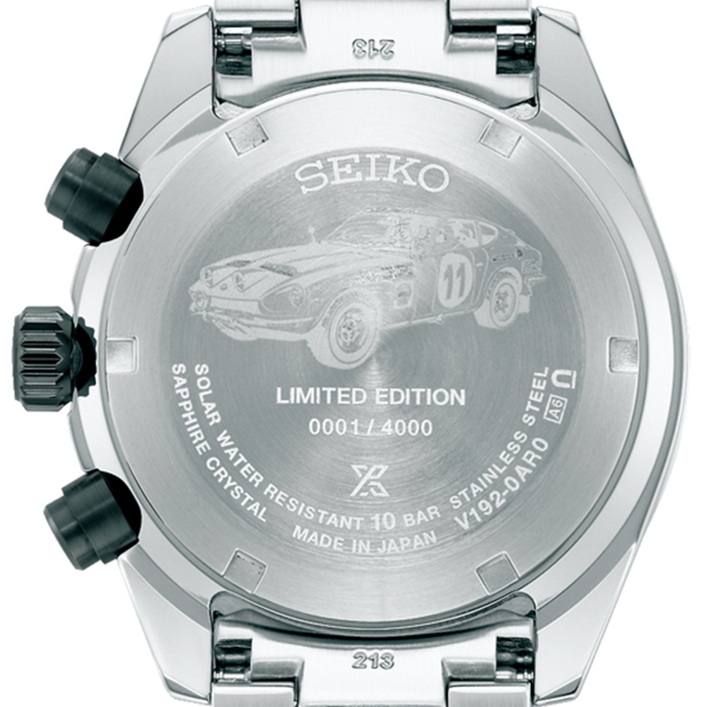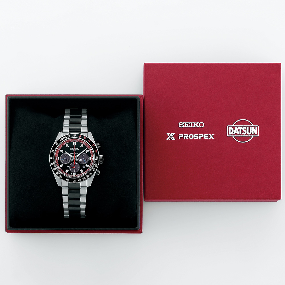 ダイヤル12時位置の「DATSUN」ロゴに加え、裏ぶたには優勝車両であるサファリカーのオリジナルイラストを表記したコラボレーション限定モデルならではの特別仕様です。