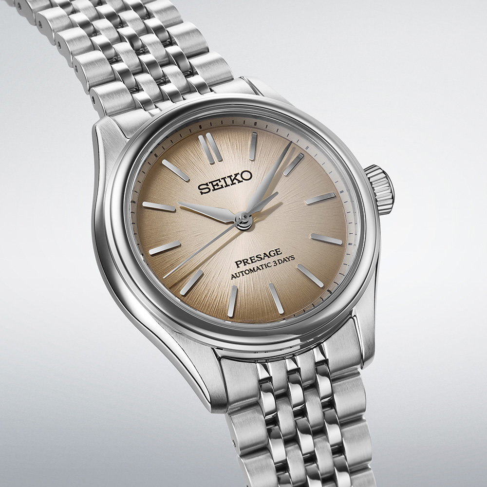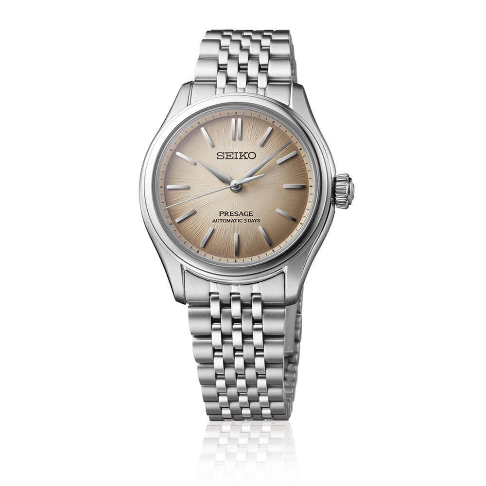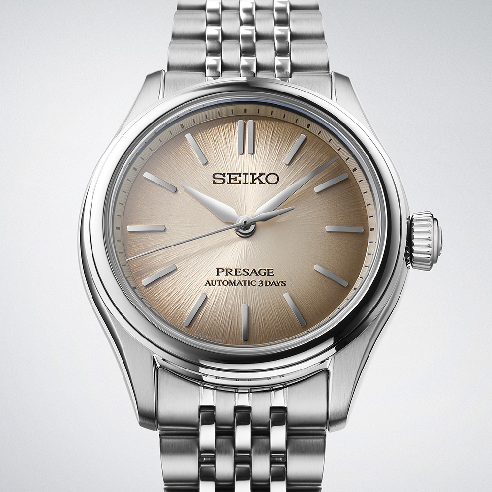 ダイヤルカラーには、柴木で染めたくすんだ茶色で、江戸時代に流行した柴色を採用。奥深いダイヤルとレトロ感のある繊細な多列ブレスレッドが、トラッドな雰囲気を醸成します。駆動方式 メカニカル 自動巻(手巻つき)