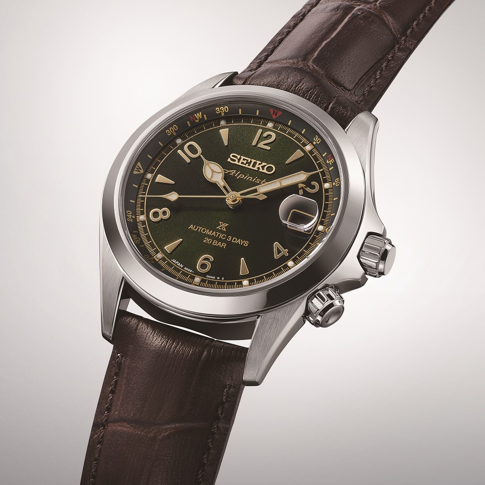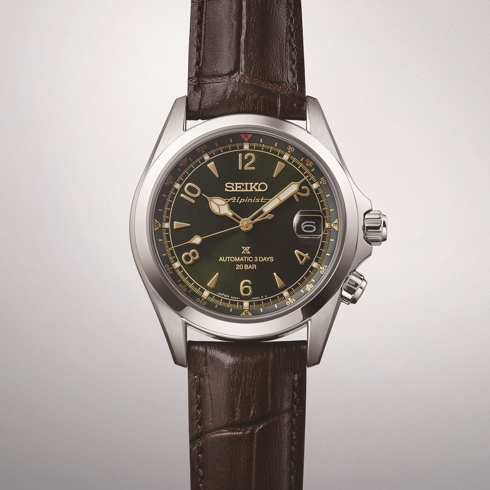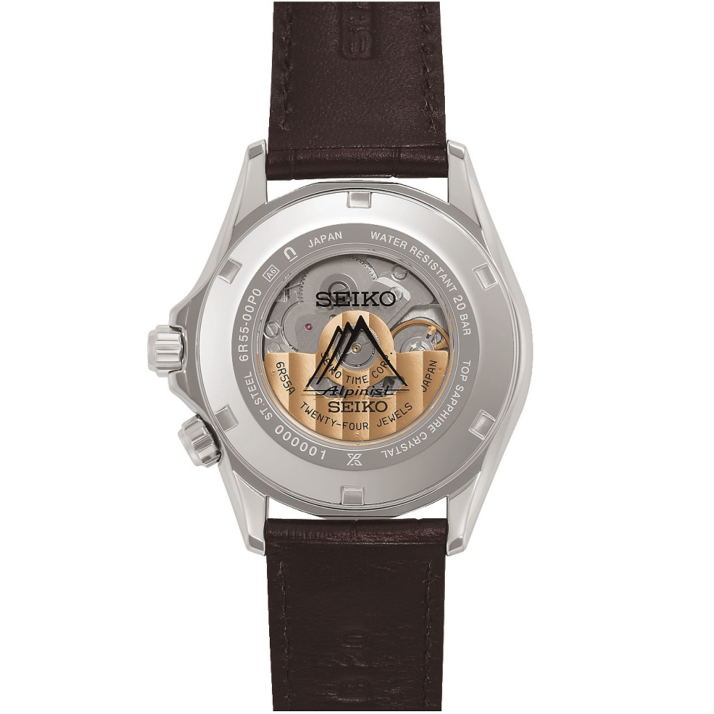 1959年に誕生した初代(ローレル)アルピニスト伝統のロゴタイプ「Alpinist」をダイヤル12時Seiko下に冠し、裏ぶたにはアルピニストを象徴する山脈をモチーフにしたマークを配する事でアルピニストならではの世界観を際立たせている。