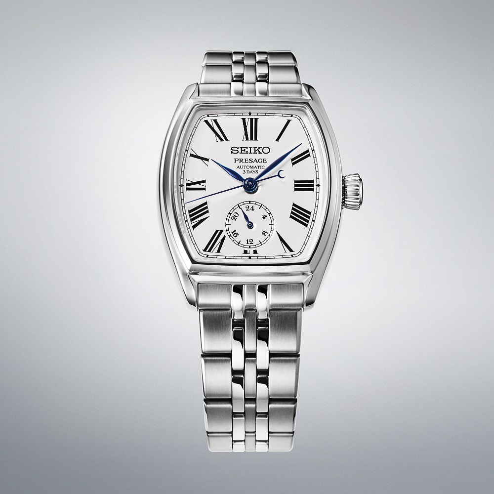 ・セイコー創成期の懐中時計「タイムキーパー」オマージュを踏襲しつつ、トノーモデルに相応しい、力強さのある書体のインデックスのローマ数字。