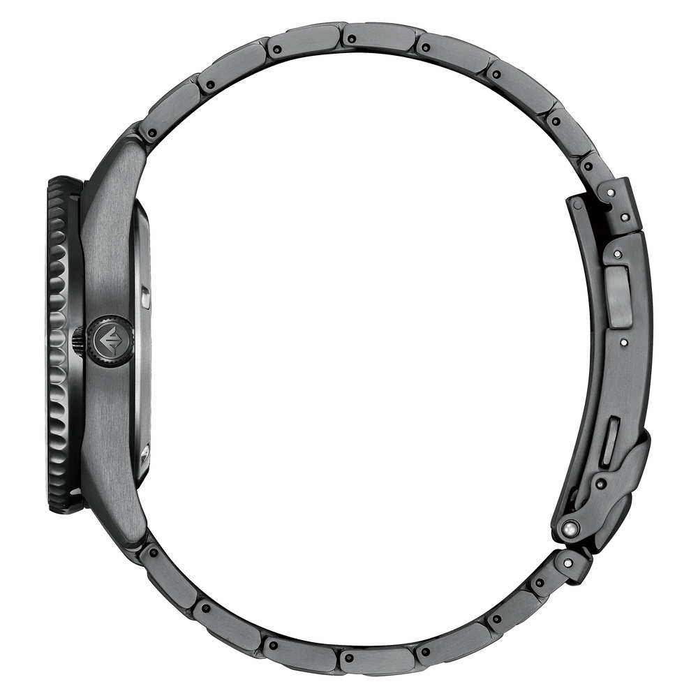 光沢感のあるブラックの外装には、小さなキズがつきにくくタフな仕様のデュラテクトDLCを採用。中央のグレーからブラックに変化するグラデーションの文字板が、海中の暗がりに太陽光が微かに差し込む情景を表現しています。