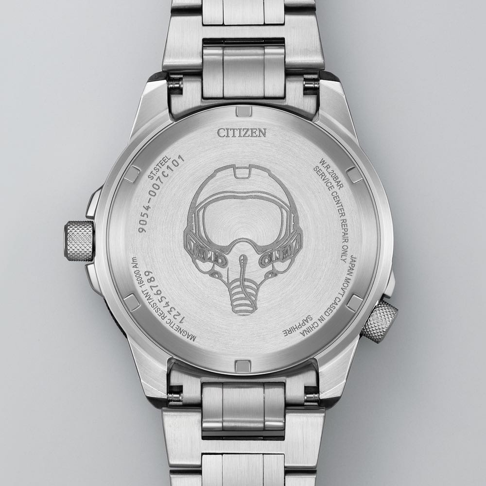 堅牢性を高めるねじロックりゅうずを3時の位置に採用。また、万が一の計器トラブルなどの際に活躍する航空用計算尺機能を回転見返しリングに配置し、操作性も追求しています。