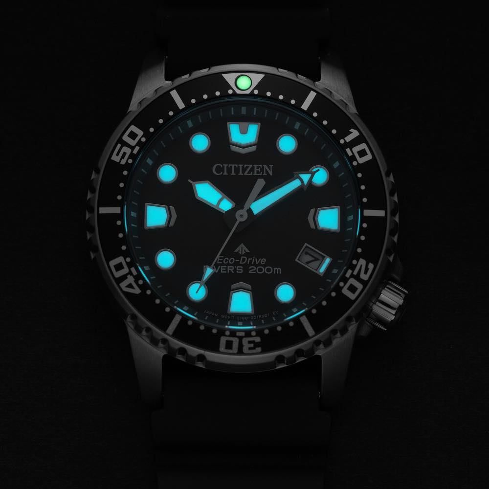 ISO規格をクリアした本格的なダイバーズウオッチ仕様。水中や暗い場所でも表示が見やすい夜光仕上げの針やインデックスを採用し、耐磁性や堅牢性も担保しています。駆動方式 ソーラー