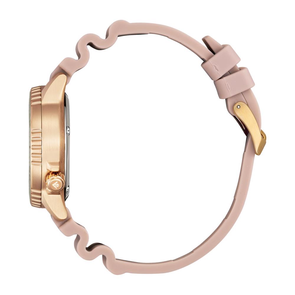 普段使いでも活躍するスポーティーなデザイン。文字板はブラック、シルバー、ブルーの3色展開。シルバー文字板は、ウォームゴールドを合わせたケースとピンクのバンドが華やかな印象を演出します。