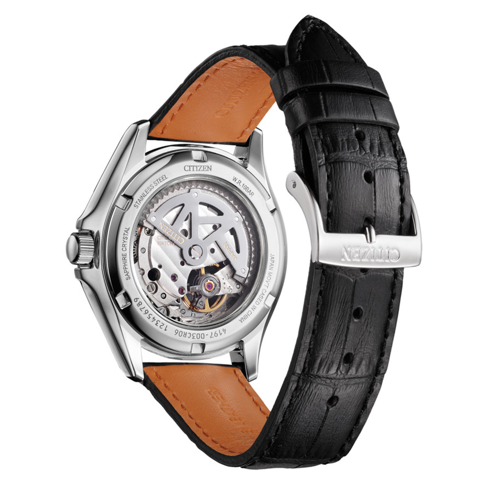 裏ぶたは、回転する錘(おもり)とメカの動きを楽しめるシースルーバックを採用しています。駆動方式 機械式(自動巻き+手巻き)