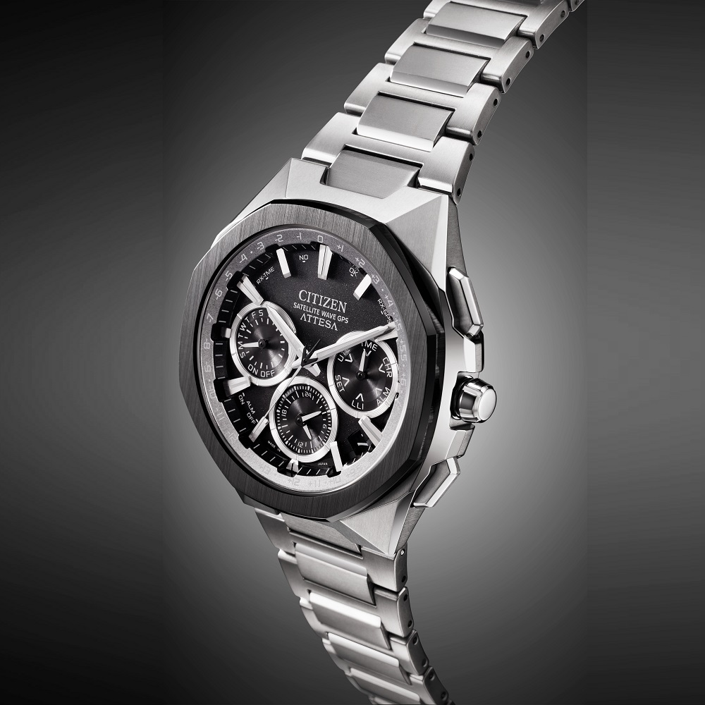 八角形のベゼルはアテッサ初のセラミックス素材。更に、フルフローのケースに異形のプッシュボタンと、新しいスタイリングを採用。
