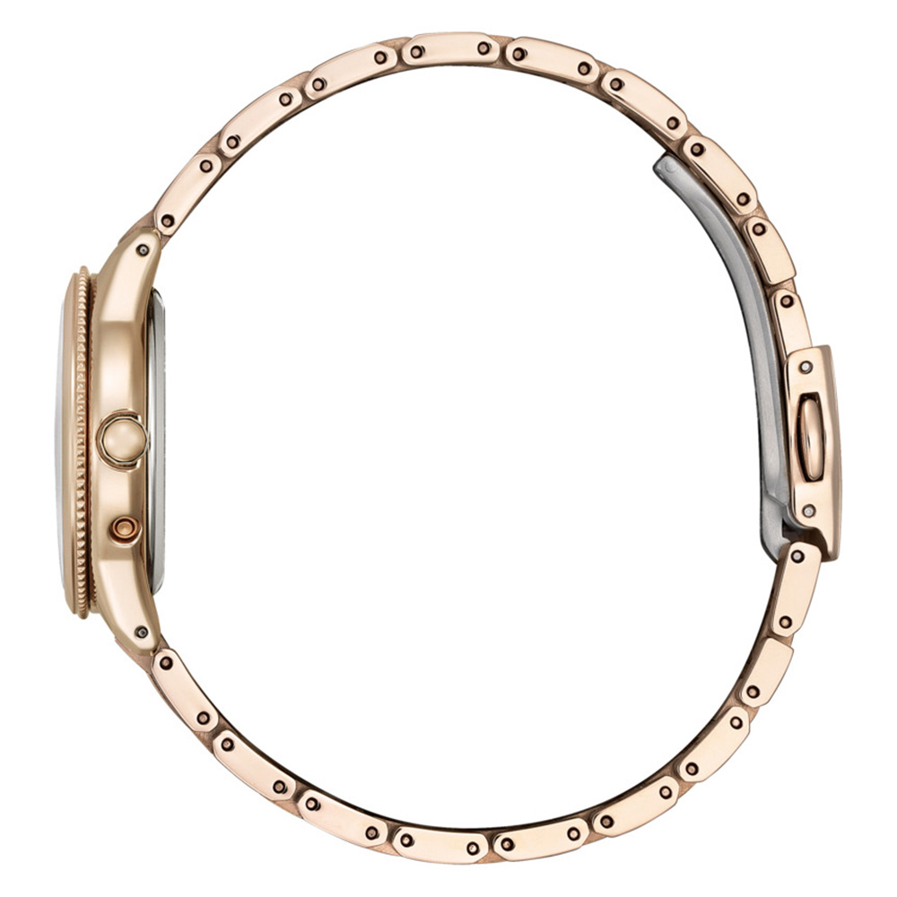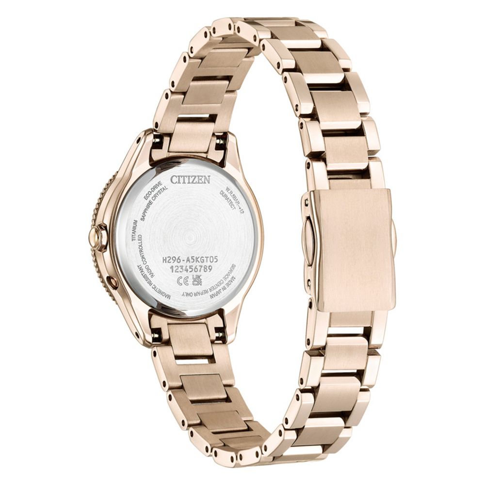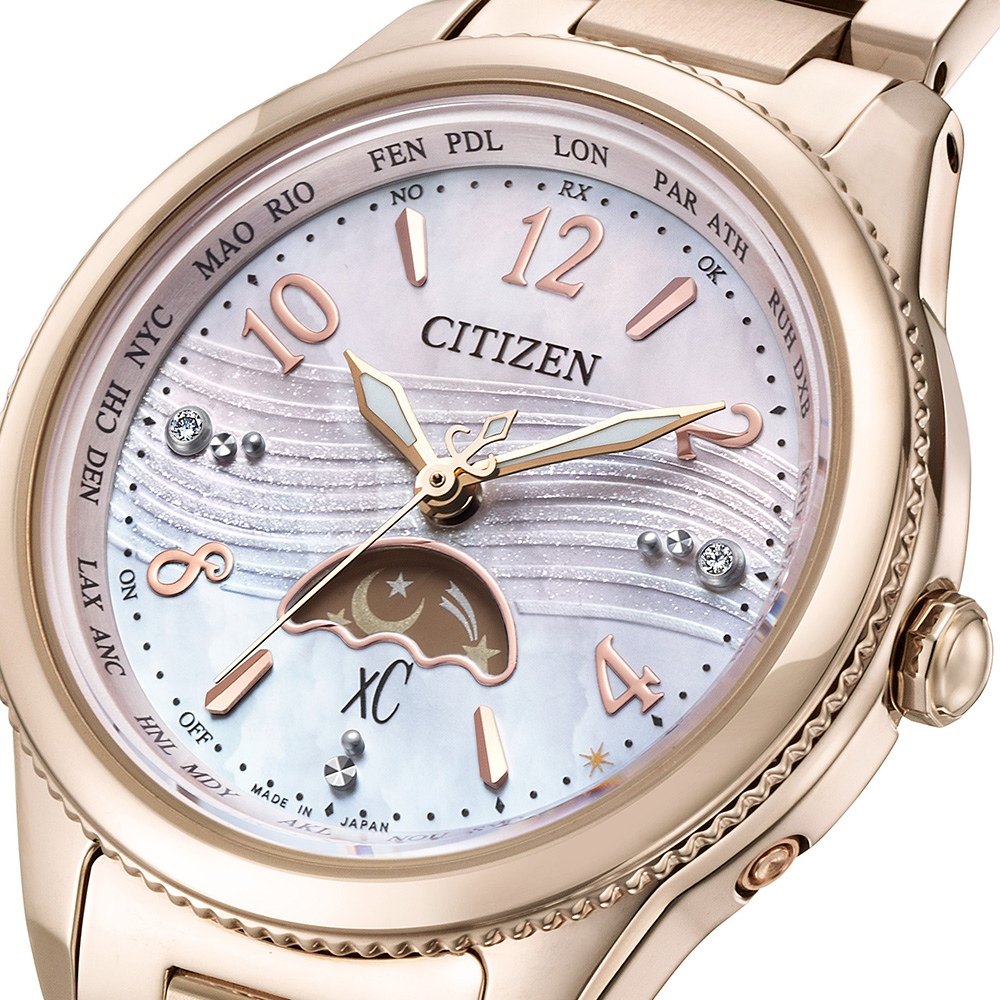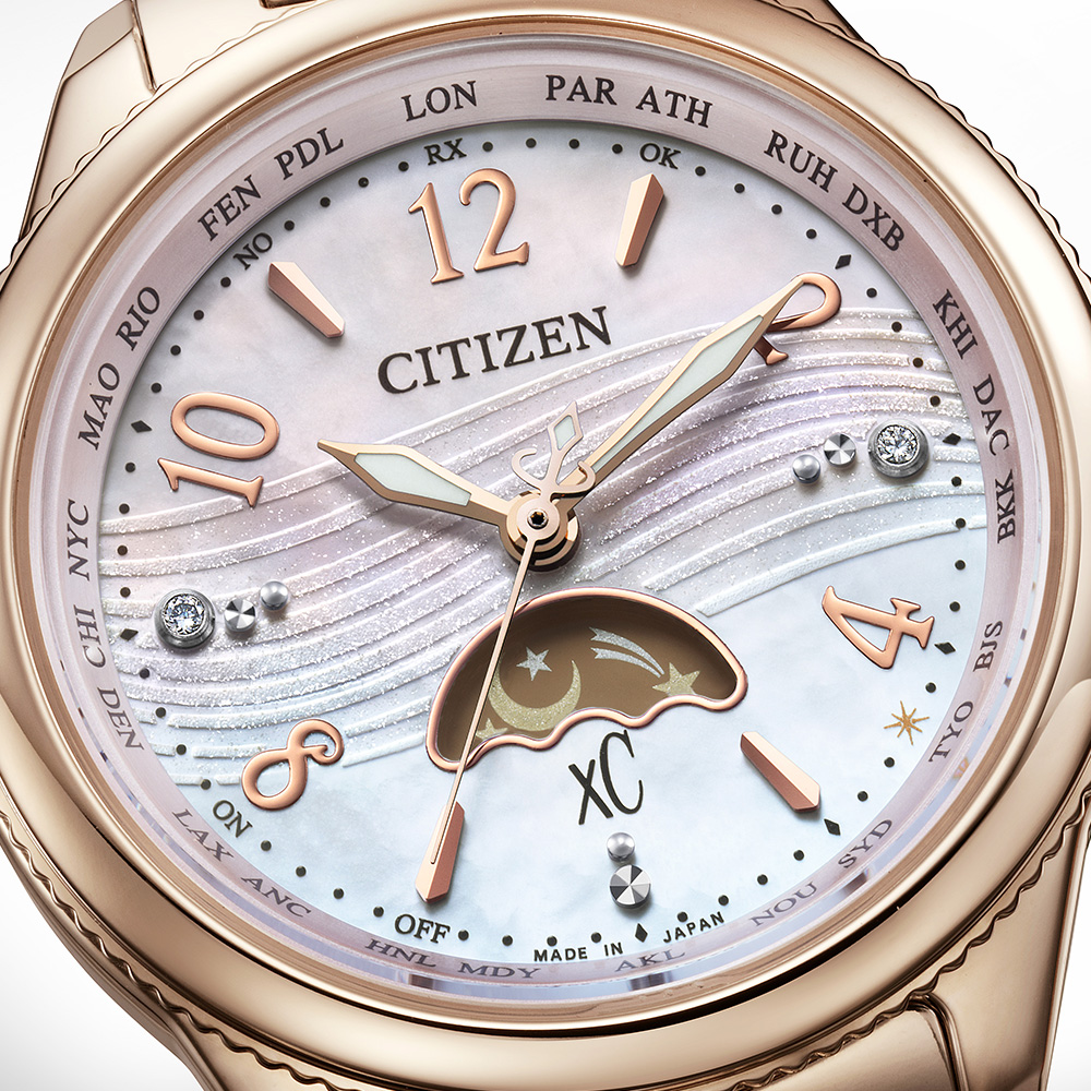 ・3時と9時の位置に2ポイントのラボグロウン・ダイヤモンドとカットパーツをあしらい、波がゆらぎ、ゆったりとした時間の流れを感じる美しい情景を表現。ワールドタイム表示のTYO位置には、夕暮れ時に輝く一番星をイメージしたモチーフをレイアウトしています。