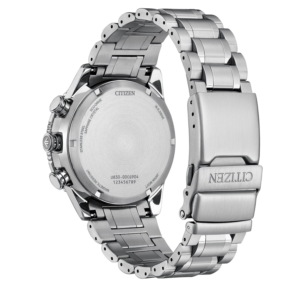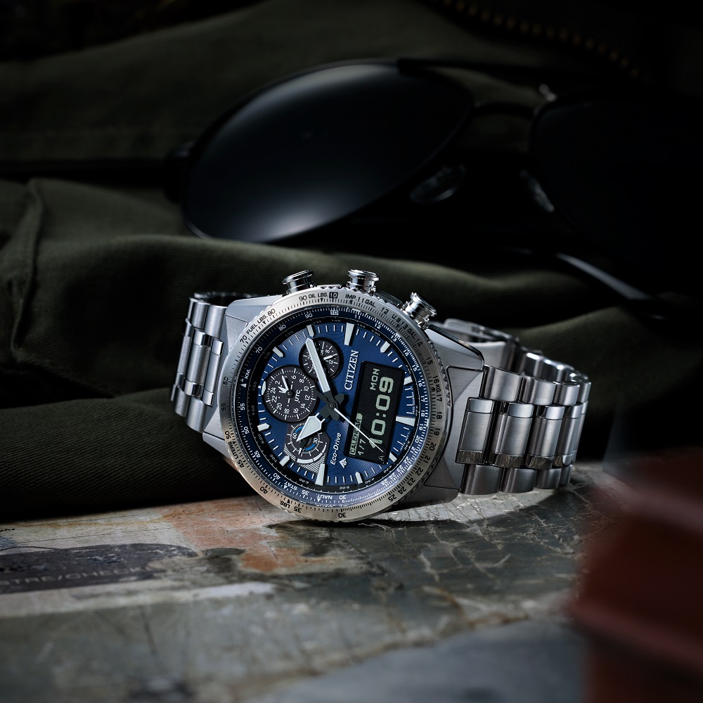 航空機のコックピットをイメージしたサブダイヤルや、航空計算尺、機体をイメージしたケースなど、パイロットウオッチらしい仕上がりに。駆動方式 ソーラー