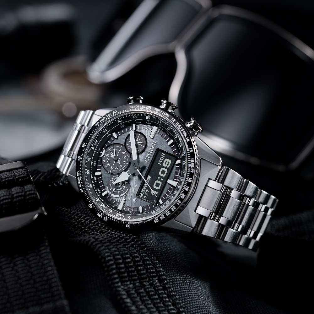航空機のコックピットをイメージしたサブダイヤルや、航空計算尺、機体をイメージしたケースなど、パイロットウオッチらしい仕上がりに。駆動方式 ソーラー