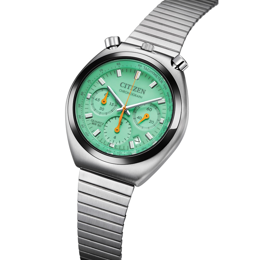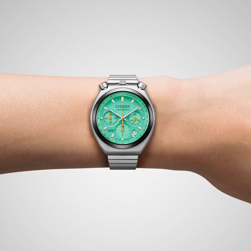 文字板に夜光塗料を施し、その上にポップなカラーを重ねた特別仕様。光を蓄えると暗闇でも文字板全
