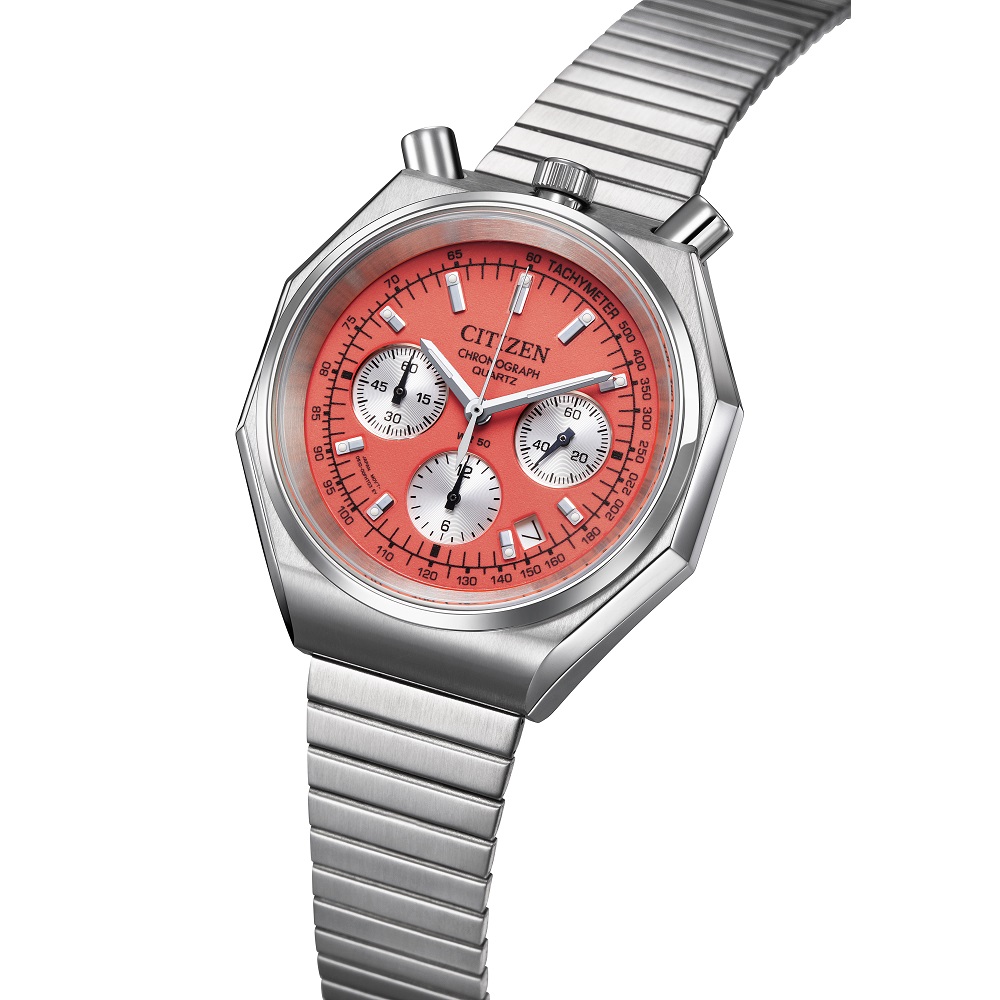 文字板に夜光塗料を施し、その上にポップなカラーを重ねた特別仕様。光を蓄えると暗闇でも文字板全