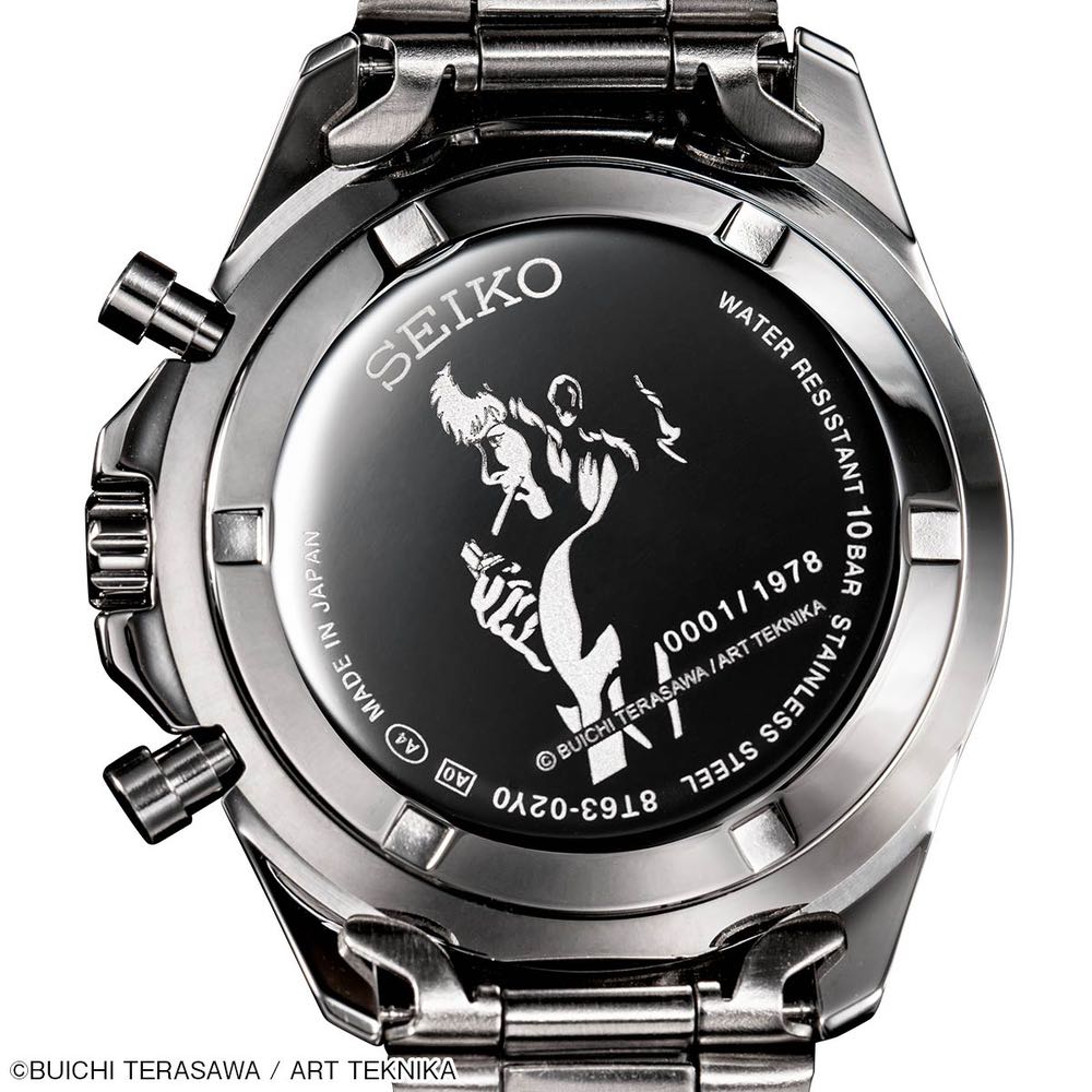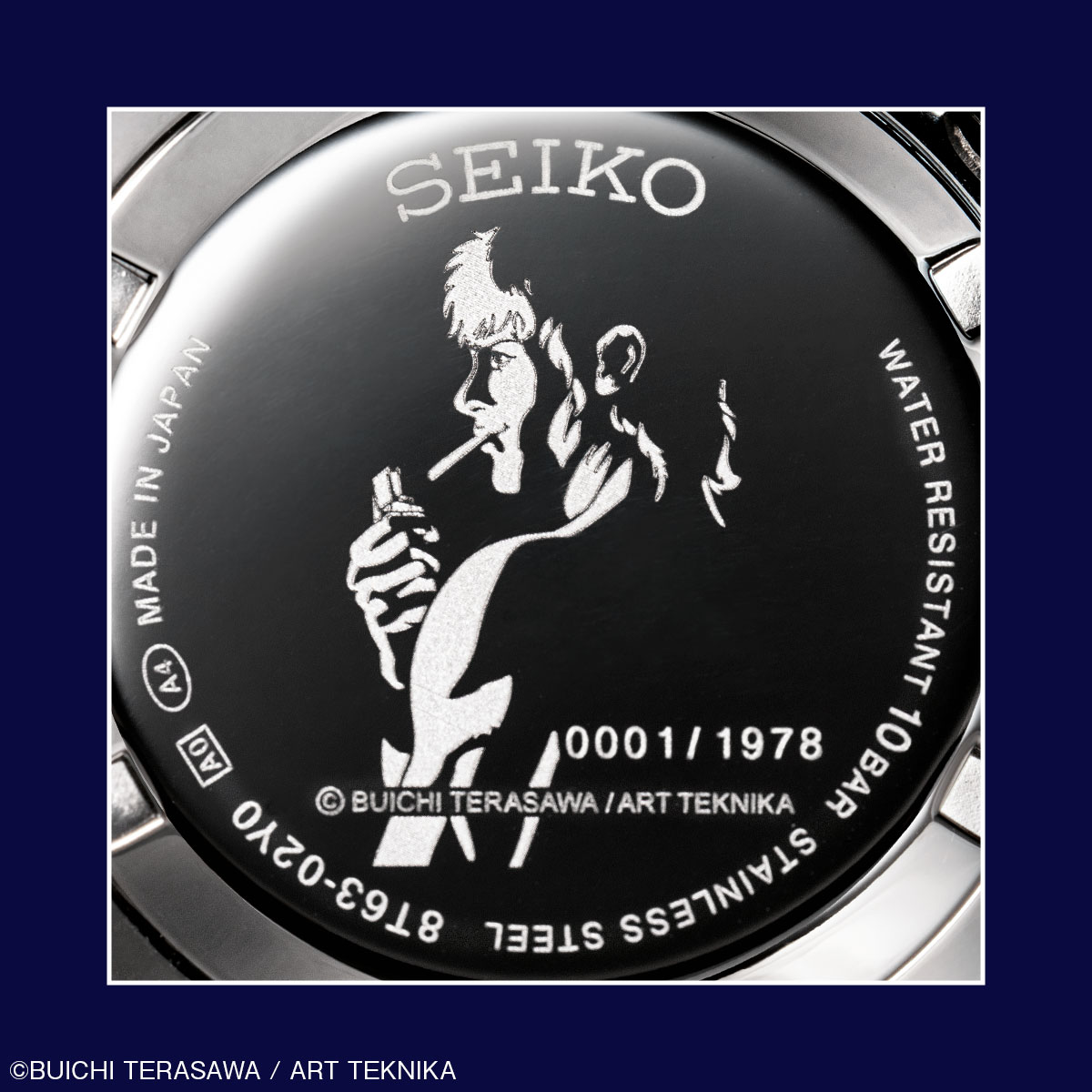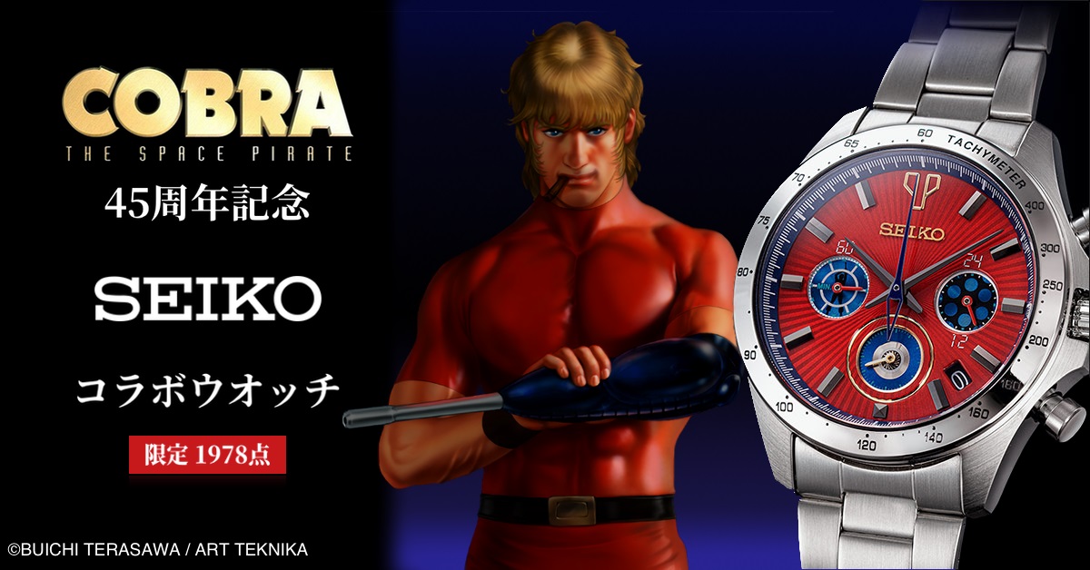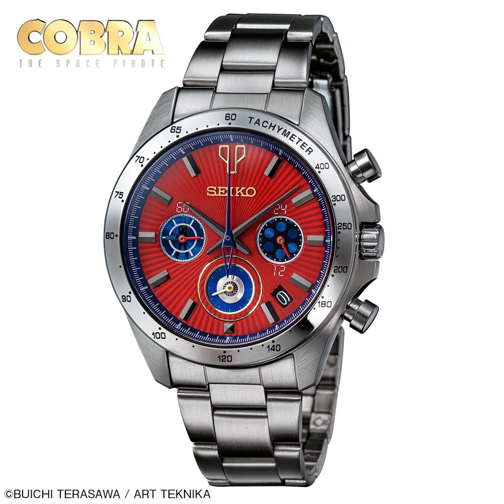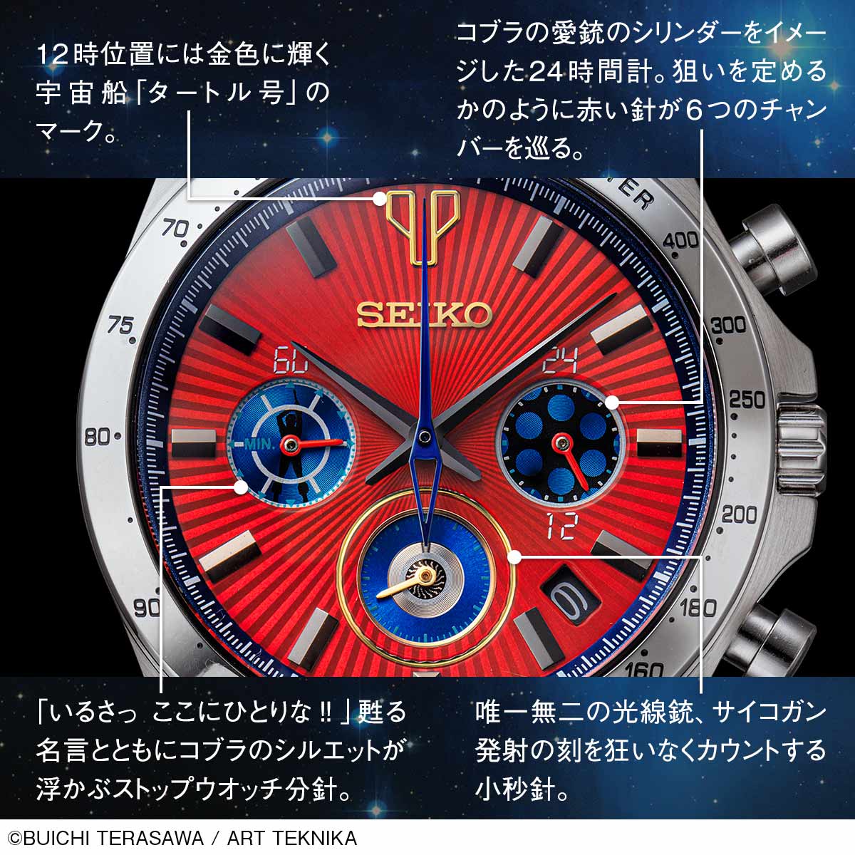 黄金色に輝く「タートル号」のマークを頂点に名場面が甦る3つのインダイヤルがコブラ連載開始45周年という、輝かしき時を刻む。