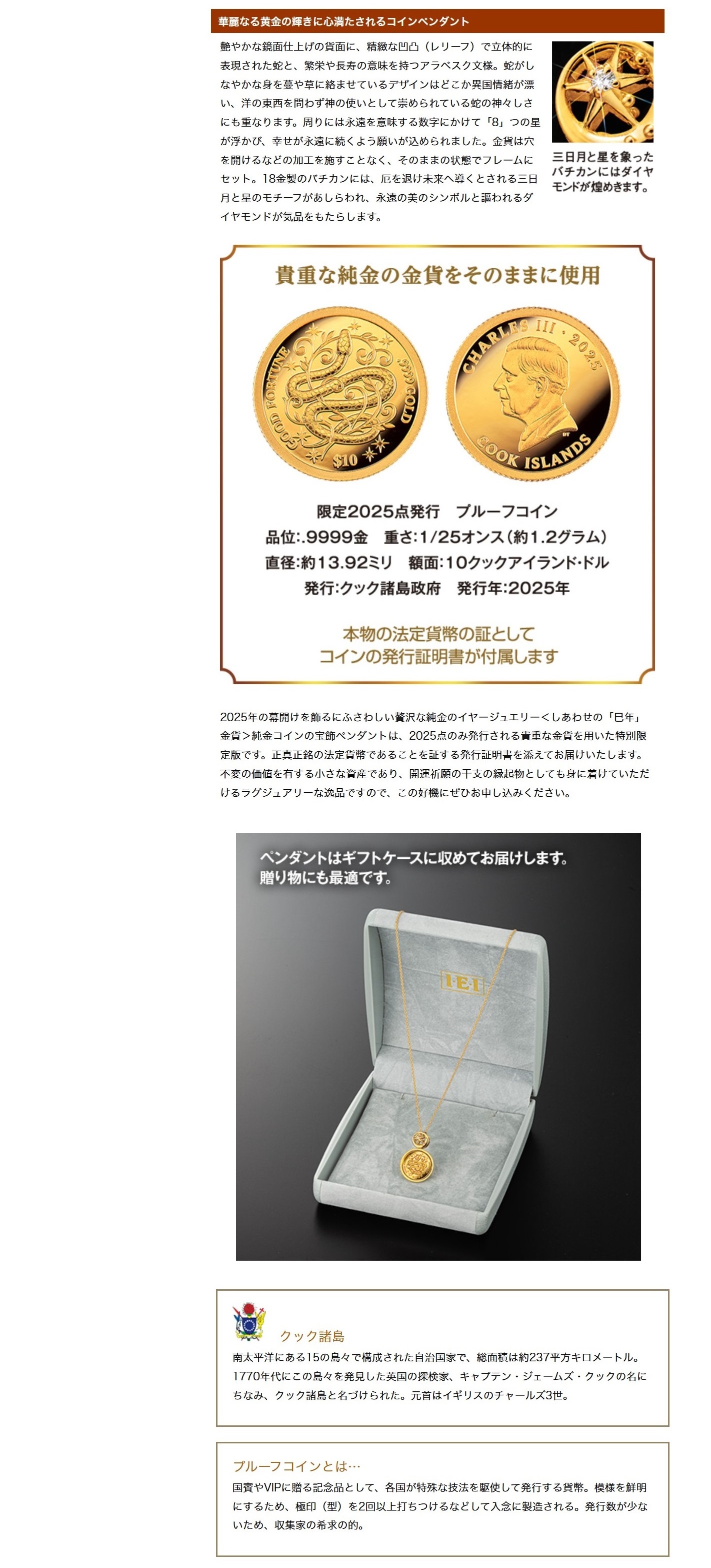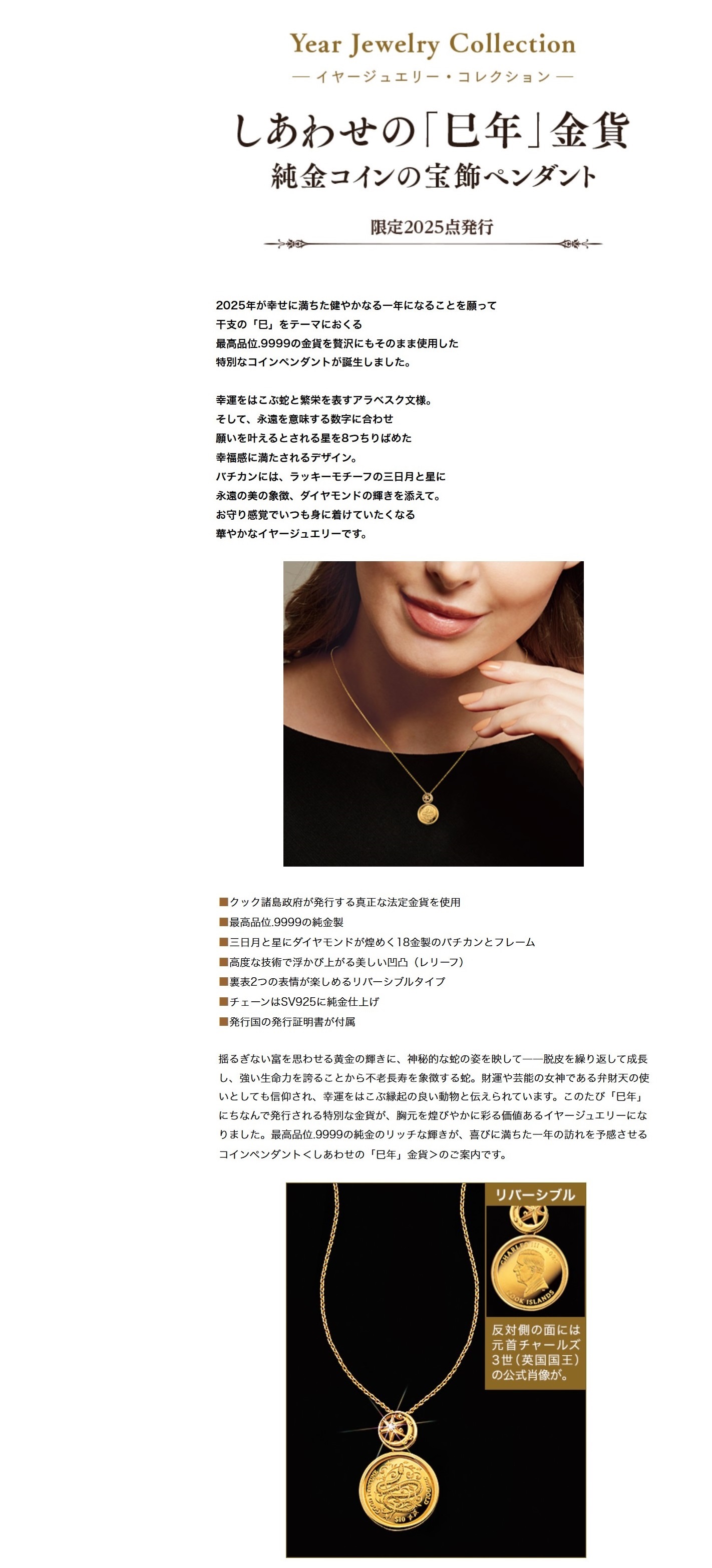 素材 ペンダントトップ=金貨(品位.9999) フレーム・バチカン=18金、ダイヤモンド1石(約0.01ct) チェーン=24金仕上げスターリング・シルバー(925銀)