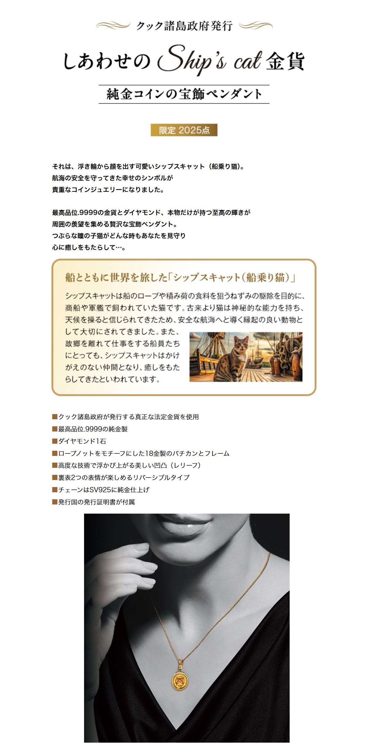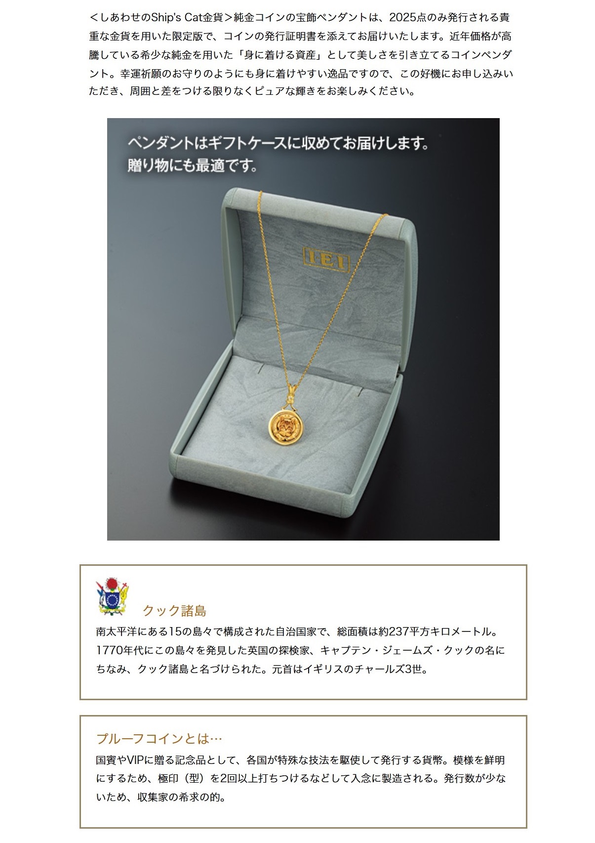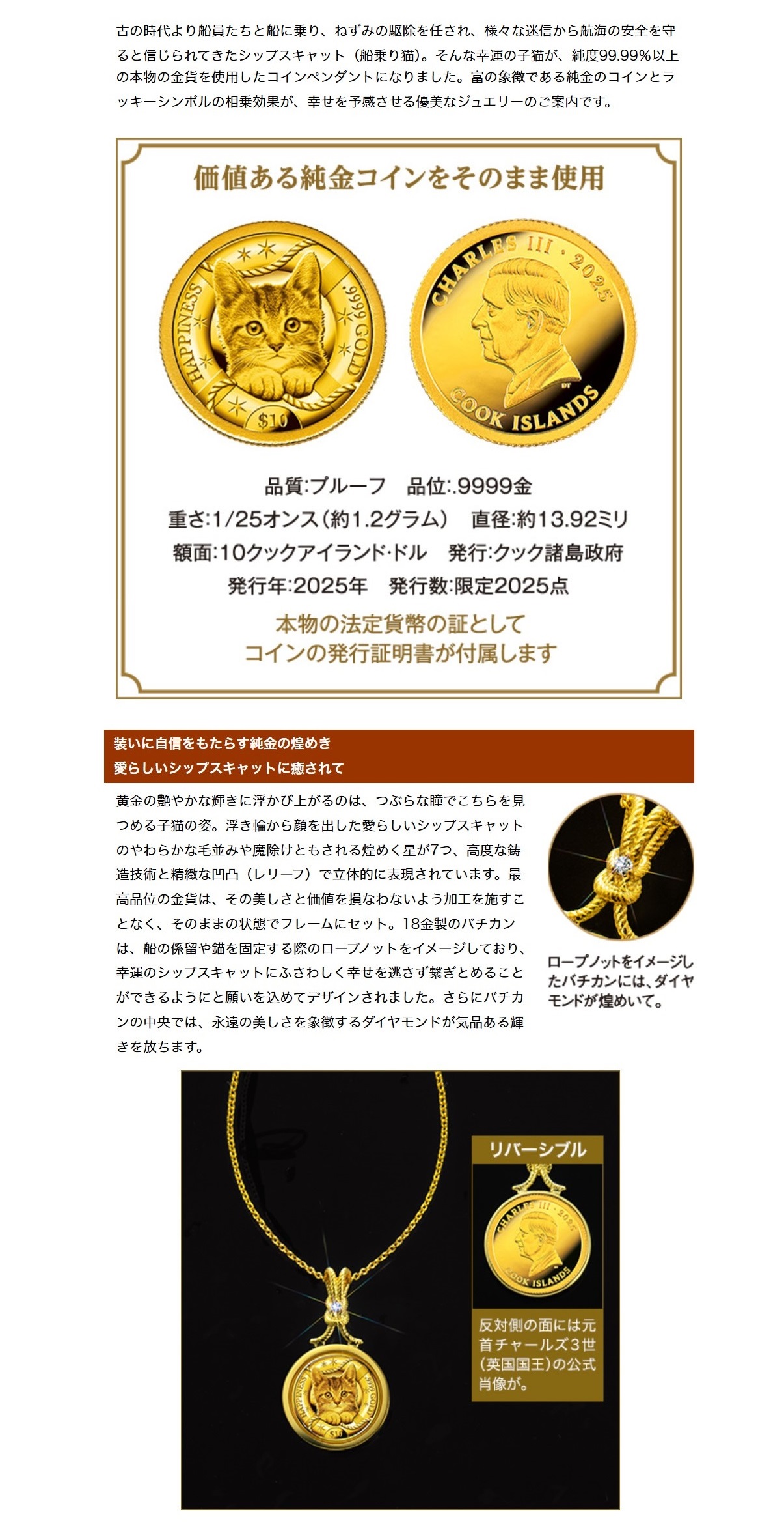 素材 | ペンダントトップ=金貨(品位.9999) フレーム・バチカン=18金、ダイヤモンド1石(約0.01ct) チェーン=24金仕上げスターリング・シルバー(925銀) |